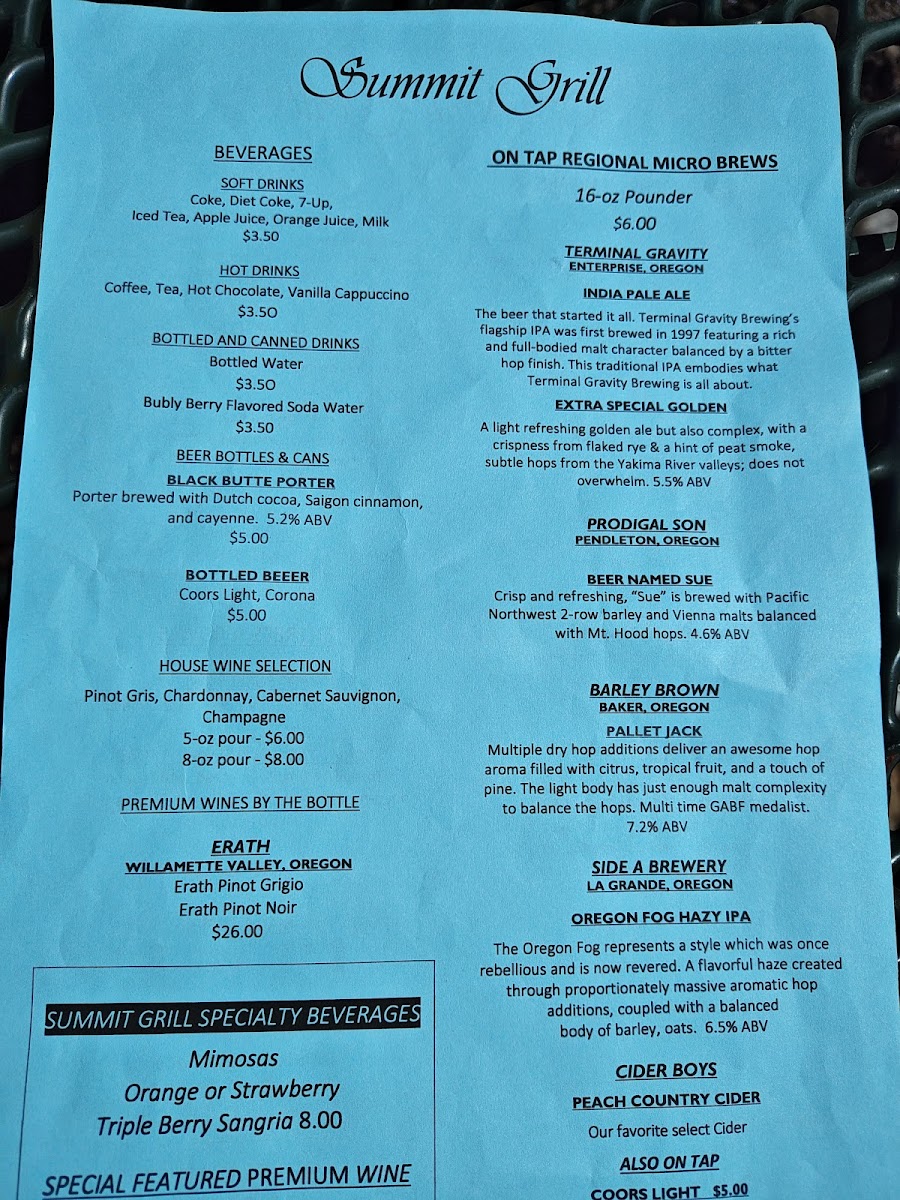 Introducing the menu at Summit Grill Joseph, perched at an astonishing elevation of 8,150 feet in Joseph, OR, this unique dining venue is not just about food; it’s about experiences. Accessed via a scenic tram ride, Summit Grill offers a limited but enticing selection of hearty options that perfectly complement its breathtaking views.